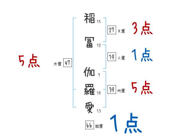 外運![]() | 稲冨伽羅愛さんの外運は47画の5つ星!実力が開花し発展する円満な人生。財に恵まれる。 生活面を象徴する運勢です。外部から受ける影響力を表し、結婚運、家庭運や職場、環境への順応性を表します。 |
