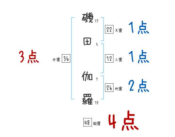 天運![]() | 磯田伽羅さんの天運は22画の1つ星!努力することが苦手ないっぽう手先が器用。芸術性にも優れる。 家系が持つ宿命的な運勢を表します。祖先から受け継いだ苗字ですので自分の力が及びません。家柄を象徴します。 |