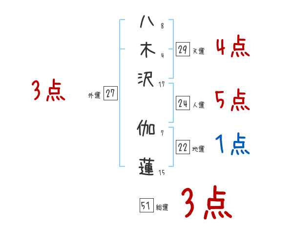 総運![]() | 八木沢伽蓮さんの総運は51画の3つ星!変化が激しく、危険に注意。堅実な性格。 あなたの人生を表す1番重要な運勢です。生涯を通じて影響する総合運となり、主に50歳以降の晩年期に影響を及ぼします。 |