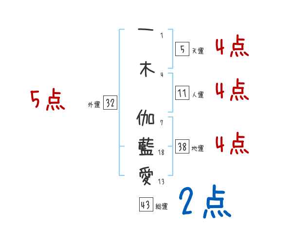 天運![]() | 一木伽藍愛さんの天運は5画の4つ星!健康で安泰。協調性に優れ、財産に恵まれる。 家系が持つ宿命的な運勢を表します。祖先から受け継いだ苗字ですので自分の力が及びません。家柄を象徴します。 |