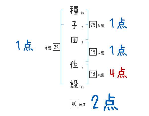 天運![]() | 種子田住設さんの天運は22画の1つ星!努力することが苦手ないっぽう手先が器用。芸術性にも優れる。 家系が持つ宿命的な運勢を表します。祖先から受け継いだ苗字ですので自分の力が及びません。家柄を象徴します。 |