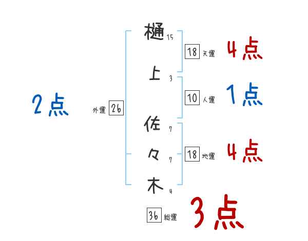 天運![]() | 樋上佐々木さんの天運は18画の4つ星!情熱的で剛気。忍耐力があり信頼される。 家系が持つ宿命的な運勢を表します。祖先から受け継いだ苗字ですので自分の力が及びません。家柄を象徴します。 |