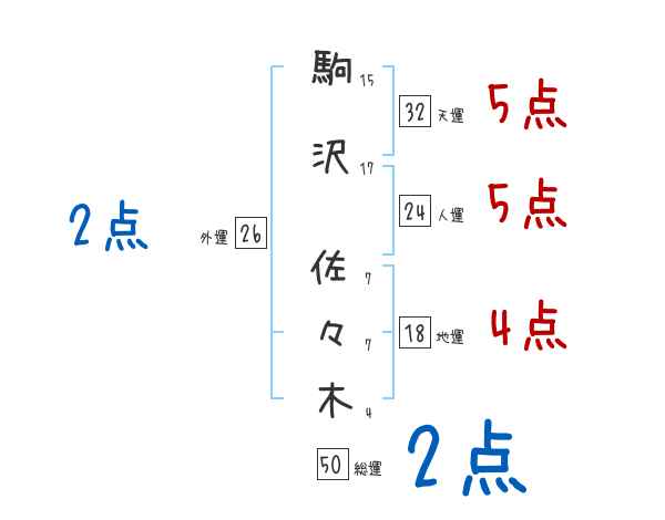 天運![]() | 駒沢佐々木さんの天運は32画の5つ星!柔軟性があり成功する。チャンスが多く金運が良い。 家系が持つ宿命的な運勢を表します。祖先から受け継いだ苗字ですので自分の力が及びません。家柄を象徴します。 |