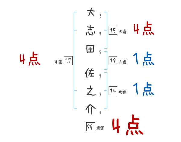 外運![]() | 大志田佐之介さんの外運は17画の4つ星!積極的な行動力。地位を気づき財産を手に入れる。純粋な心と直感力。 生活面を象徴する運勢です。外部から受ける影響力を表し、結婚運、家庭運や職場、環境への順応性を表します。 |