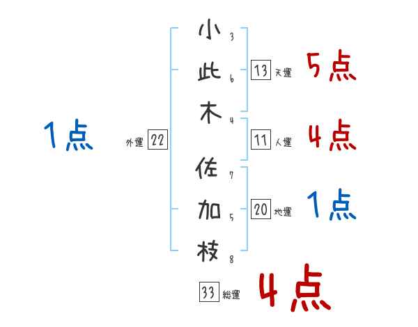外運![]() | 小此木佐加枝さんの外運は22画の1つ星!努力することが苦手ないっぽう手先が器用。芸術性にも優れる。 生活面を象徴する運勢です。外部から受ける影響力を表し、結婚運、家庭運や職場、環境への順応性を表します。 |
