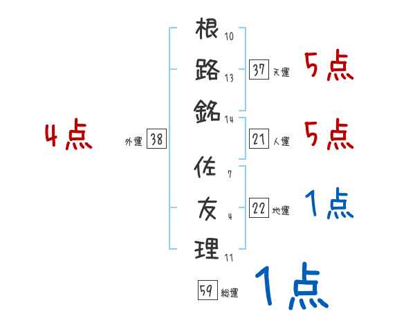 外運![]() | 根路銘佐友理さんの外運は38画の4つ星!温厚な性格で技術的な才能を発揮する。職人的な仕事に向いている。 生活面を象徴する運勢です。外部から受ける影響力を表し、結婚運、家庭運や職場、環境への順応性を表します。 |