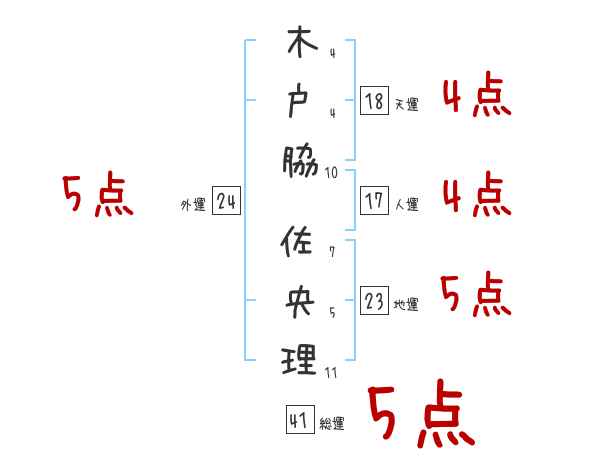 外運![]() | 木戸脇佐央理さんの外運は24画の5つ星!家庭運が良く順調な人生。金運にも恵まれる。 生活面を象徴する運勢です。外部から受ける影響力を表し、結婚運、家庭運や職場、環境への順応性を表します。 |