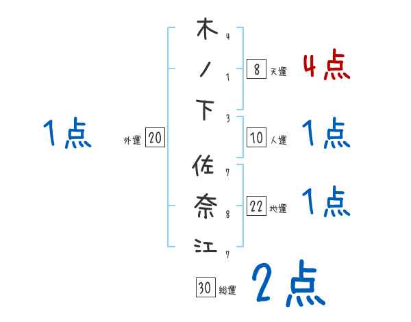 天運![]() | 木ノ下佐奈江さんの天運は8画の4つ星!勤勉家。根気強く努力し成功する。忍耐力がある。 家系が持つ宿命的な運勢を表します。祖先から受け継いだ苗字ですので自分の力が及びません。家柄を象徴します。 |