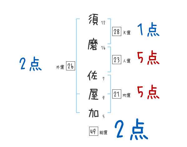 人運![]() | 須磨佐屋加さんの人運は23画の5つ星!想像力に優れ活力がある。一代で成功し名誉を手に入れる。 性格や才能などを表す2番目に重要な運勢です。人間関係や協調性、社会的な成功に影響します。主に20歳から50歳ぐらいまでの中年期の運勢を表します。 |