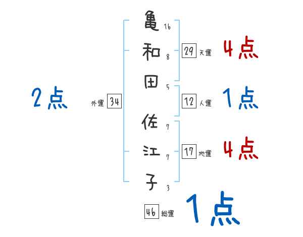 総運![]() | 亀和田佐江子さんの総運は46画の1つ星!迷走することが多く苦労するかも。目先のことにとらわれないように。 あなたの人生を表す1番重要な運勢です。生涯を通じて影響する総合運となり、主に50歳以降の晩年期に影響を及ぼします。 |