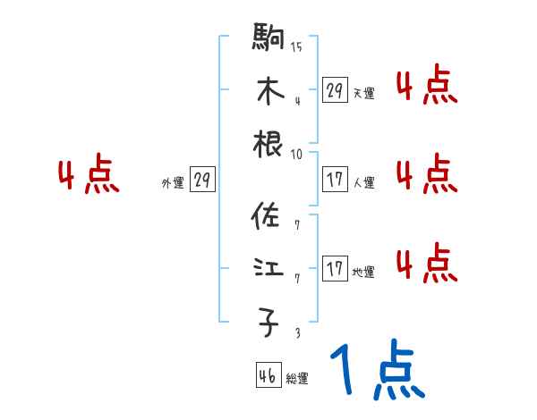 天運![]() | 駒木根佐江子さんの天運は29画の4つ星!完全主義で才能がある。厳格な心の持ち主。 家系が持つ宿命的な運勢を表します。祖先から受け継いだ苗字ですので自分の力が及びません。家柄を象徴します。 |