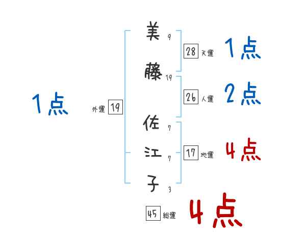 天運![]() | 美藤佐江子さんの天運は28画の1つ星!家庭環境に注意。スポーツで活躍できる能力があるかも。 家系が持つ宿命的な運勢を表します。祖先から受け継いだ苗字ですので自分の力が及びません。家柄を象徴します。 |