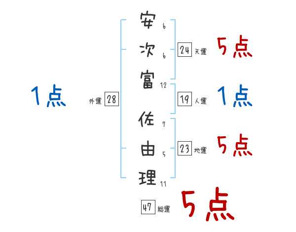 天運![]() | 安次富佐由理さんの天運は24画の5つ星!家庭運が良く順調な人生。金運にも恵まれる。 家系が持つ宿命的な運勢を表します。祖先から受け継いだ苗字ですので自分の力が及びません。家柄を象徴します。 |