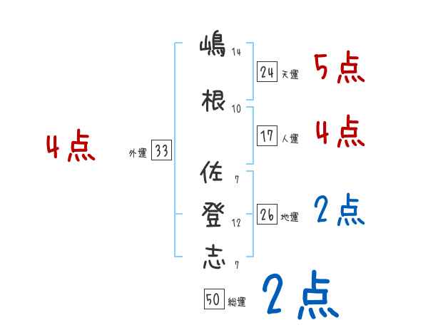 外運![]() | 嶋根佐登志さんの外運は33画の4つ星!権力志向でプライドが高い。勇気があり運を切り開き成功する。 生活面を象徴する運勢です。外部から受ける影響力を表し、結婚運、家庭運や職場、環境への順応性を表します。 |