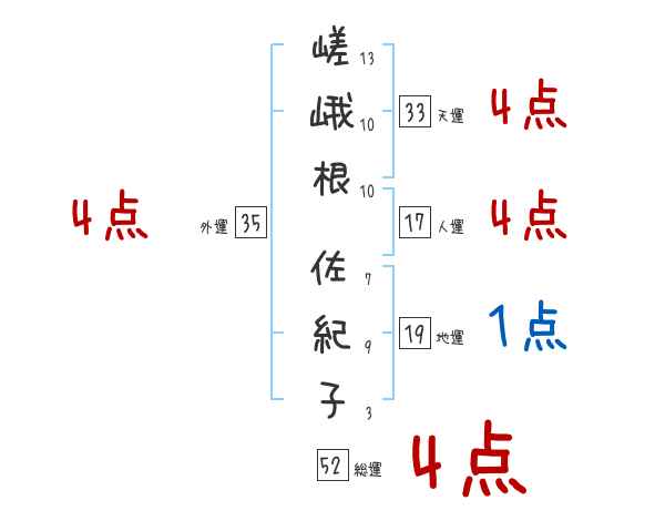 天運![]() | 嵯峨根佐紀子さんの天運は33画の4つ星!権力志向でプライドが高い。勇気があり運を切り開き成功する。 家系が持つ宿命的な運勢を表します。祖先から受け継いだ苗字ですので自分の力が及びません。家柄を象徴します。 |