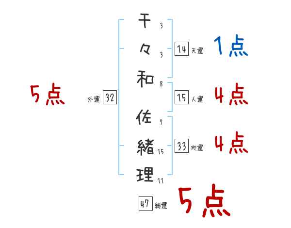 外運![]() | 千々和佐緒理さんの外運は32画の5つ星!柔軟性があり成功する。チャンスが多く金運が良い。 生活面を象徴する運勢です。外部から受ける影響力を表し、結婚運、家庭運や職場、環境への順応性を表します。 |
