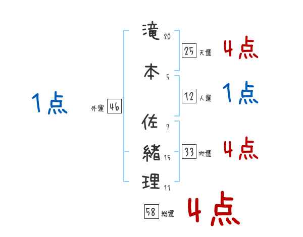 地運![]() | 滝本佐緒理さんの地運は33画の4つ星!権力志向でプライドが高い。勇気があり運を切り開き成功する。 個性を表す基礎的な運勢です。性格形成や対人関係、行動力など家庭環境に影響されます。主に誕生してから20歳くらいまでの若年期の運勢を表します。 |