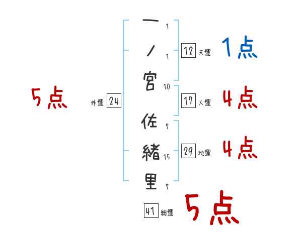 天運![]() | 一ノ宮佐緒里さんの天運は12画の1つ星!簡単な失敗で諦めてしまいやすいかも。着実に行動すると良いでしょう。 家系が持つ宿命的な運勢を表します。祖先から受け継いだ苗字ですので自分の力が及びません。家柄を象徴します。 |