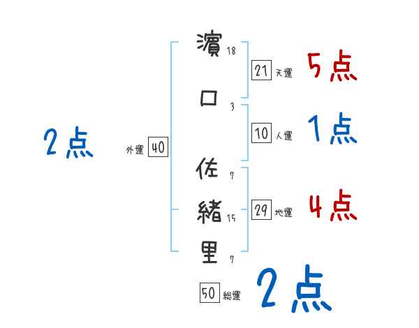 総運![]() | 濵口佐緒里さんの総運は50画の2つ星!浮き沈みが激しく不安定。しりすぼみに衰退しやすいので注意しましょう。 あなたの人生を表す1番重要な運勢です。生涯を通じて影響する総合運となり、主に50歳以降の晩年期に影響を及ぼします。 |