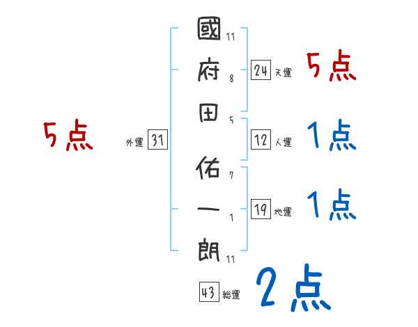 天運![]() | 國府田佑一朗さんの天運は24画の5つ星!家庭運が良く順調な人生。金運にも恵まれる。 家系が持つ宿命的な運勢を表します。祖先から受け継いだ苗字ですので自分の力が及びません。家柄を象徴します。 |