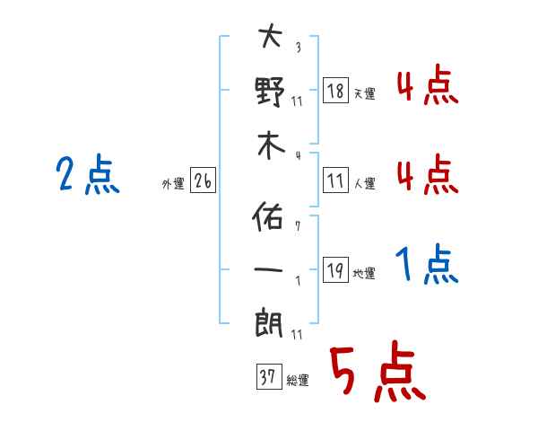 天運![]() | 大野木佑一朗さんの天運は18画の4つ星!情熱的で剛気。忍耐力があり信頼される。 家系が持つ宿命的な運勢を表します。祖先から受け継いだ苗字ですので自分の力が及びません。家柄を象徴します。 |