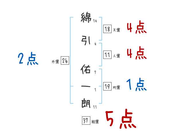 天運![]() | 綿引佑一朗さんの天運は18画の4つ星!情熱的で剛気。忍耐力があり信頼される。 家系が持つ宿命的な運勢を表します。祖先から受け継いだ苗字ですので自分の力が及びません。家柄を象徴します。 |