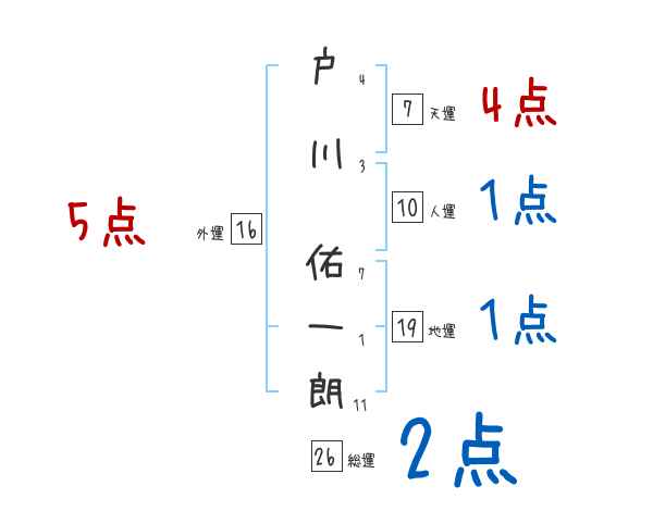 外運![]() | 戸川佑一朗さんの外運は16画の5つ星!人望が厚く大きく発展する。逆転成功が見える。 生活面を象徴する運勢です。外部から受ける影響力を表し、結婚運、家庭運や職場、環境への順応性を表します。 |