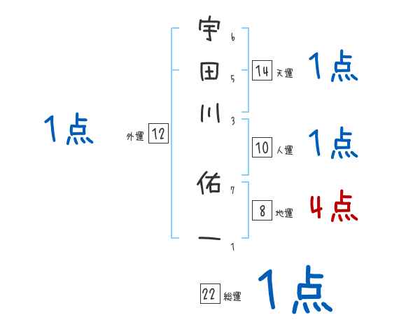 総運![]() | 宇田川佑一さんの総運は22画の1つ星!努力することが苦手ないっぽう手先が器用。芸術性にも優れる。 あなたの人生を表す1番重要な運勢です。生涯を通じて影響する総合運となり、主に50歳以降の晩年期に影響を及ぼします。 |