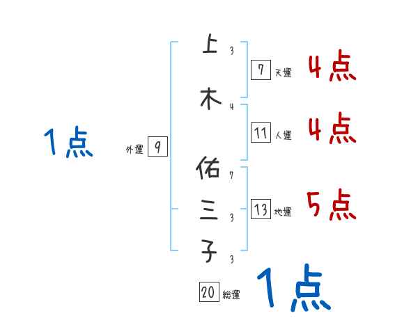 天運![]() | 上木佑三子さんの天運は7画の4つ星!強い意志や信念を持ち独立心が強い。自立する。 家系が持つ宿命的な運勢を表します。祖先から受け継いだ苗字ですので自分の力が及びません。家柄を象徴します。 |