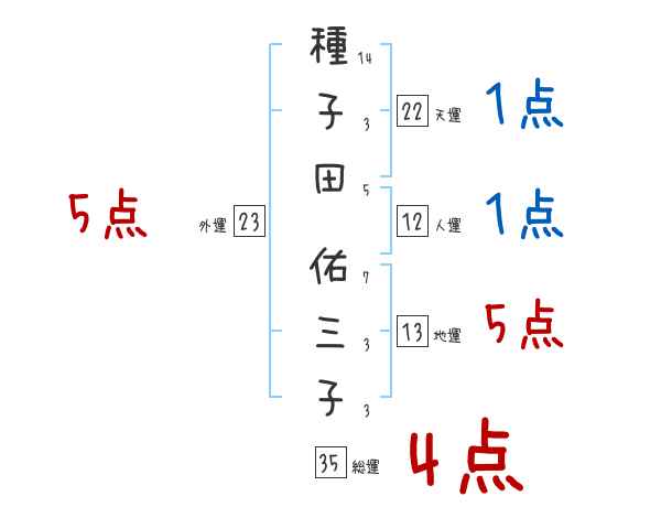 外運![]() | 種子田佑三子さんの外運は23画の5つ星!想像力に優れ活力がある。一代で成功し名誉を手に入れる。 生活面を象徴する運勢です。外部から受ける影響力を表し、結婚運、家庭運や職場、環境への順応性を表します。 |