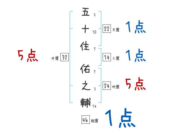 外運![]() | 五十住佑之輔さんの外運は32画の5つ星!柔軟性があり成功する。チャンスが多く金運が良い。 生活面を象徴する運勢です。外部から受ける影響力を表し、結婚運、家庭運や職場、環境への順応性を表します。 |