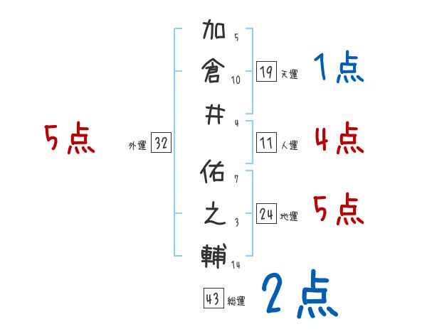 外運![]() | 加倉井佑之輔さんの外運は32画の5つ星!柔軟性があり成功する。チャンスが多く金運が良い。 生活面を象徴する運勢です。外部から受ける影響力を表し、結婚運、家庭運や職場、環境への順応性を表します。 |