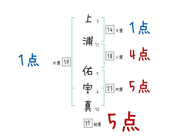 天運![]() | 上浦佑宇真さんの天運は14画の1つ星!人に対して優しいがストレスを溜め込みがち。人間関係のトラブルを避けるよう気をつけましょう。 家系が持つ宿命的な運勢を表します。祖先から受け継いだ苗字ですので自分の力が及びません。家柄を象徴します。 |