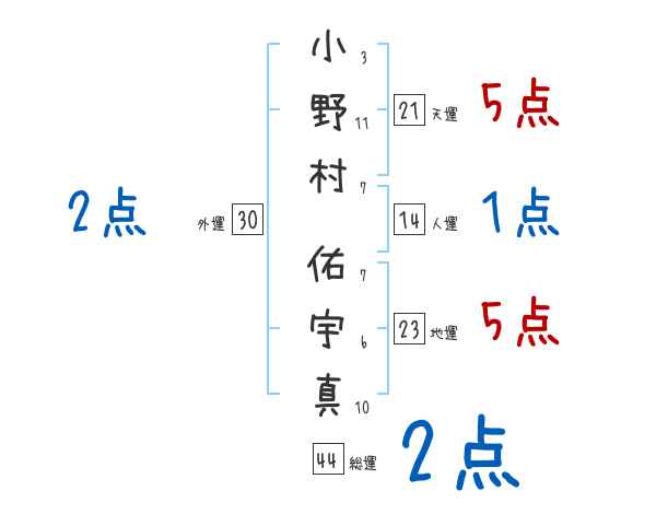 外運![]() | 小野村佑宇真さんの外運は30画の2つ星!浮き沈みの激しさに注意しましょう。 生活面を象徴する運勢です。外部から受ける影響力を表し、結婚運、家庭運や職場、環境への順応性を表します。 |