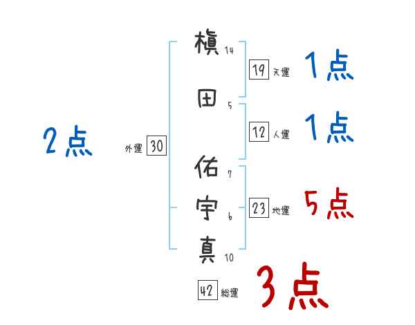 天運![]() | 槇田佑宇真さんの天運は19画の1つ星!優れた才能を持ちますが、協調性が足りないことも。周りの人と協力する事を意識しましょう。 家系が持つ宿命的な運勢を表します。祖先から受け継いだ苗字ですので自分の力が及びません。家柄を象徴します。 |