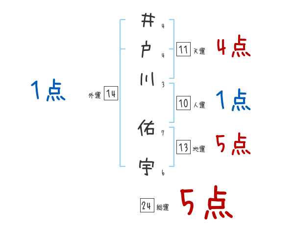 天運![]() | 井戸川佑宇さんの天運は11画の4つ星!着実に富や地位を得る幸運な人生。 家系が持つ宿命的な運勢を表します。祖先から受け継いだ苗字ですので自分の力が及びません。家柄を象徴します。 |