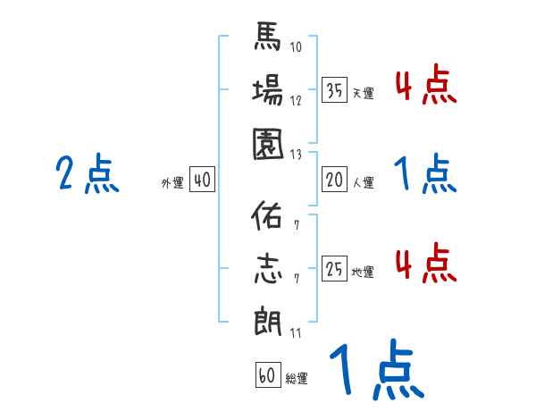 天運![]() | 馬場園佑志朗さんの天運は35画の4つ星!温厚な性格で感受性が高い。穏和な性格で人望が厚い。 家系が持つ宿命的な運勢を表します。祖先から受け継いだ苗字ですので自分の力が及びません。家柄を象徴します。 |