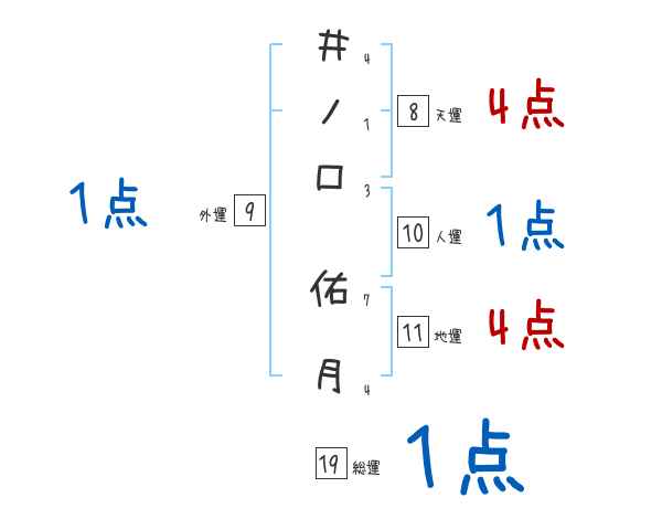 総運![]() | 井ノ口佑月さんの総運は19画の1つ星!優れた才能を持ちますが、協調性が足りないことも。周りの人と協力する事を意識しましょう。 あなたの人生を表す1番重要な運勢です。生涯を通じて影響する総合運となり、主に50歳以降の晩年期に影響を及ぼします。 |