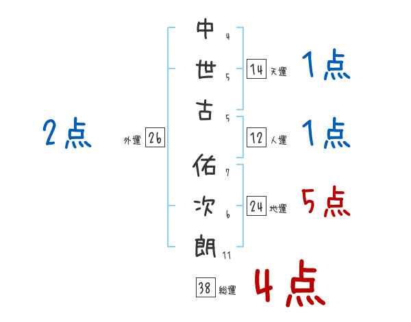 天運![]() | 中世古佑次朗さんの天運は14画の1つ星!人に対して優しいがストレスを溜め込みがち。人間関係のトラブルを避けるよう気をつけましょう。 家系が持つ宿命的な運勢を表します。祖先から受け継いだ苗字ですので自分の力が及びません。家柄を象徴します。 |