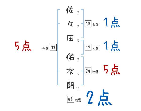総運![]() | 佐々田佑次朗さんの総運は43画の2つ星!頑固な性格で独立心が強いかも。やや非現実的で浪費に注意しましょう。 あなたの人生を表す1番重要な運勢です。生涯を通じて影響する総合運となり、主に50歳以降の晩年期に影響を及ぼします。 |