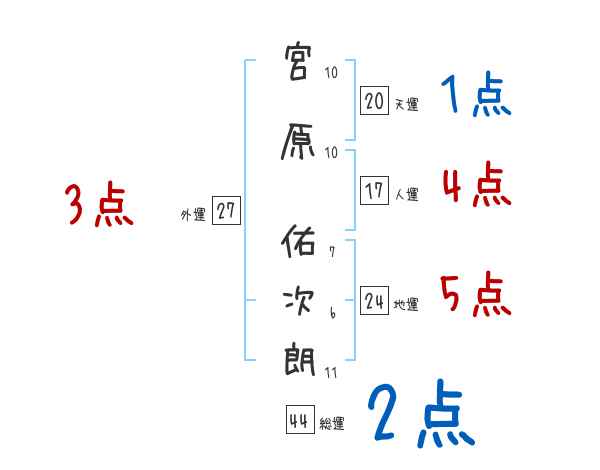 総運![]() | 宮原佑次朗さんの総運は44画の2つ星!誠実で慎重な性格。物事を考えすぎないように注意しましょう。 あなたの人生を表す1番重要な運勢です。生涯を通じて影響する総合運となり、主に50歳以降の晩年期に影響を及ぼします。 |