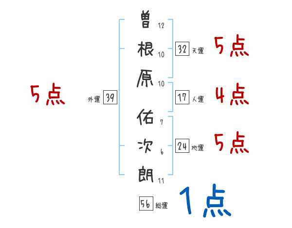 総運![]() | 曽根原佑次朗さんの総運は56画の1つ星!消極的で無気力になりがち。誠実な気持ちが必要でしょう。 あなたの人生を表す1番重要な運勢です。生涯を通じて影響する総合運となり、主に50歳以降の晩年期に影響を及ぼします。 |