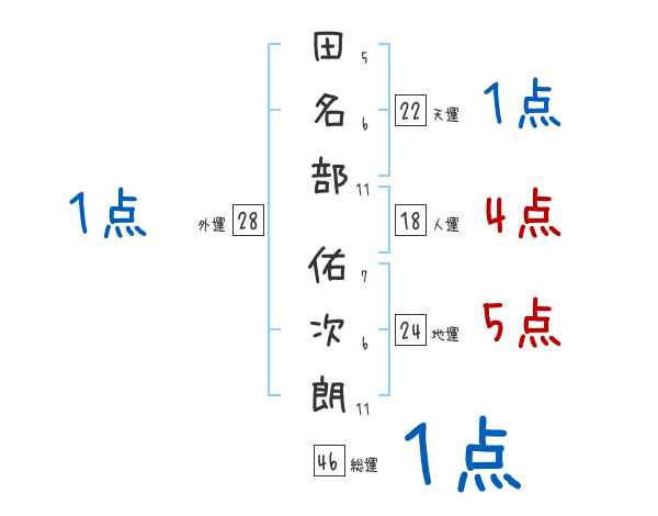 天運![]() | 田名部佑次朗さんの天運は22画の1つ星!努力することが苦手ないっぽう手先が器用。芸術性にも優れる。 家系が持つ宿命的な運勢を表します。祖先から受け継いだ苗字ですので自分の力が及びません。家柄を象徴します。 |