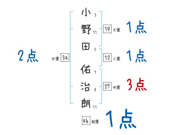 地運![]() | 小野田佑治朗さんの地運は27画の3つ星!頭脳明晰だが強情で摩擦が多い傾向。孤立に注意。 個性を表す基礎的な運勢です。性格形成や対人関係、行動力など家庭環境に影響されます。主に誕生してから20歳くらいまでの若年期の運勢を表します。 |
