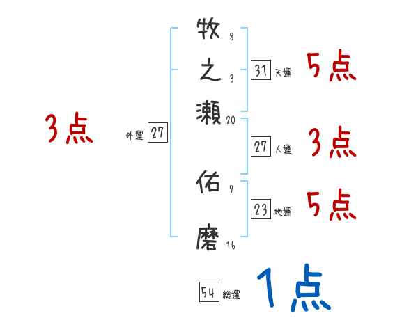 天運![]() | 牧之瀬佑磨さんの天運は31画の5つ星!社交性があり判断力に優れる。順風満帆な人生で円満な生活。 家系が持つ宿命的な運勢を表します。祖先から受け継いだ苗字ですので自分の力が及びません。家柄を象徴します。 |