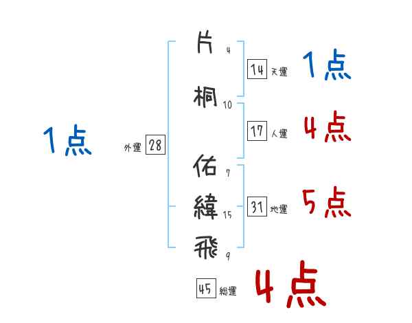 地運![]() | 片桐佑緯飛さんの地運は31画の5つ星!社交性があり判断力に優れる。順風満帆な人生で円満な生活。 個性を表す基礎的な運勢です。性格形成や対人関係、行動力など家庭環境に影響されます。主に誕生してから20歳くらいまでの若年期の運勢を表します。 |