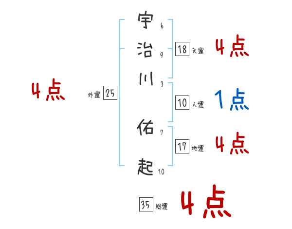 総運![]() | 宇治川佑起さんの総運は35画の4つ星!温厚な性格で感受性が高い。穏和な性格で人望が厚い。 あなたの人生を表す1番重要な運勢です。生涯を通じて影響する総合運となり、主に50歳以降の晩年期に影響を及ぼします。 |