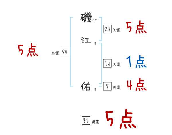 外運![]() | 磯江佑さんの外運は24画の5つ星!家庭運が良く順調な人生。金運にも恵まれる。 生活面を象徴する運勢です。外部から受ける影響力を表し、結婚運、家庭運や職場、環境への順応性を表します。 |