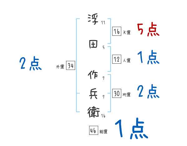 天運![]() | 浮田作兵衛さんの天運は16画の5つ星!人望が厚く大きく発展する。逆転成功が見える。 家系が持つ宿命的な運勢を表します。祖先から受け継いだ苗字ですので自分の力が及びません。家柄を象徴します。 |