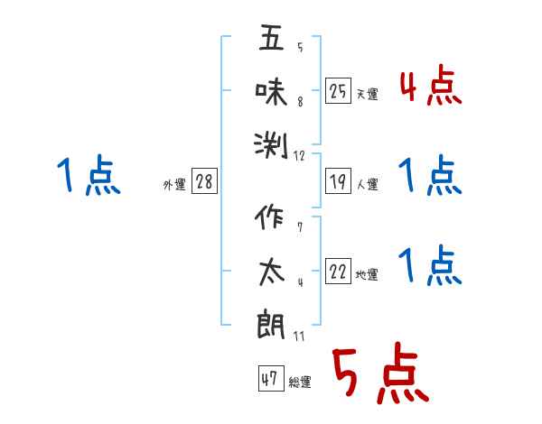 総運![]() | 五味渕作太朗さんの総運は47画の5つ星!実力が開花し発展する円満な人生。財に恵まれる。 あなたの人生を表す1番重要な運勢です。生涯を通じて影響する総合運となり、主に50歳以降の晩年期に影響を及ぼします。 |